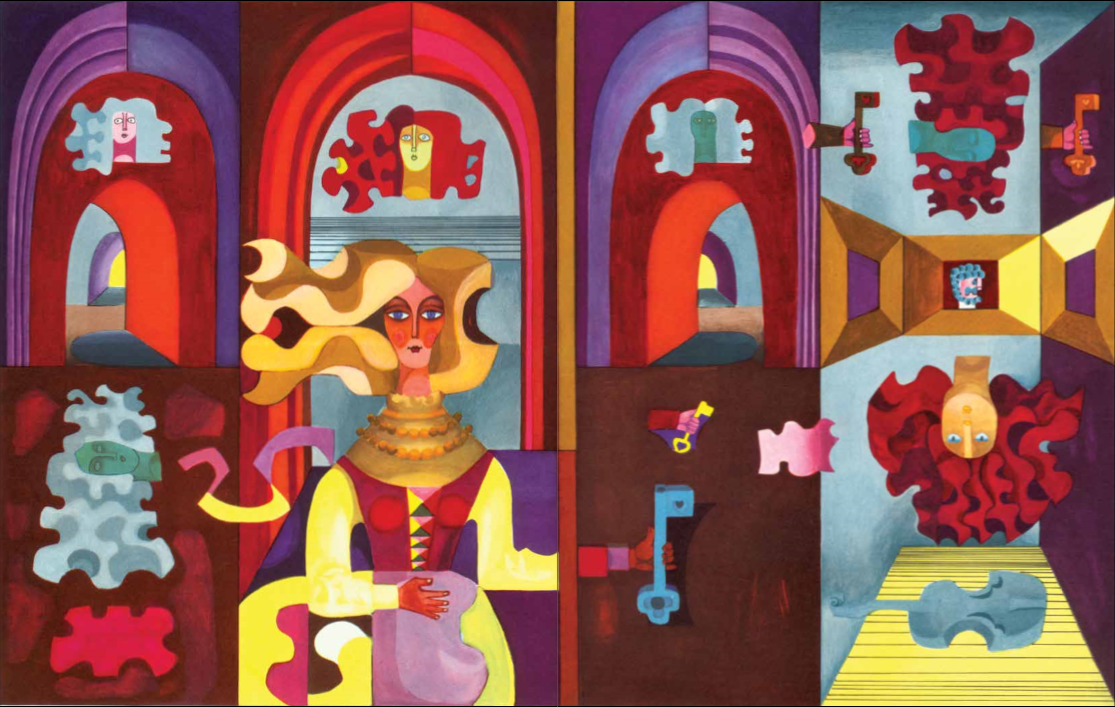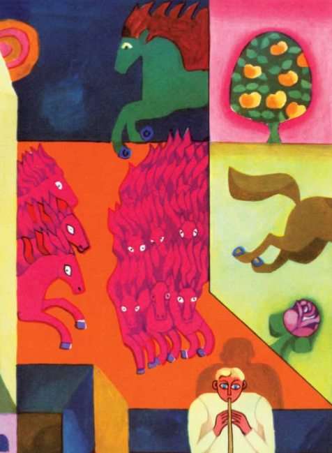Ir atjojo kartą į aludario kiemą dvylika vaizbūnų ant juodų žirgų kaip slibinų, o vyresnysis tų vaizbūnų buvo su žalia barzda, o ir šiaip švankus vyras, su aukso diržu, su kalaviju, brangakmeniais sagstytu. Nebebuvo mergaitei kas daro – susodino vaizbūnus už baltų skobnių ir saldžiu midum užgėrė.