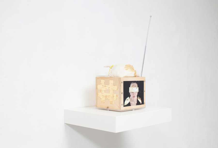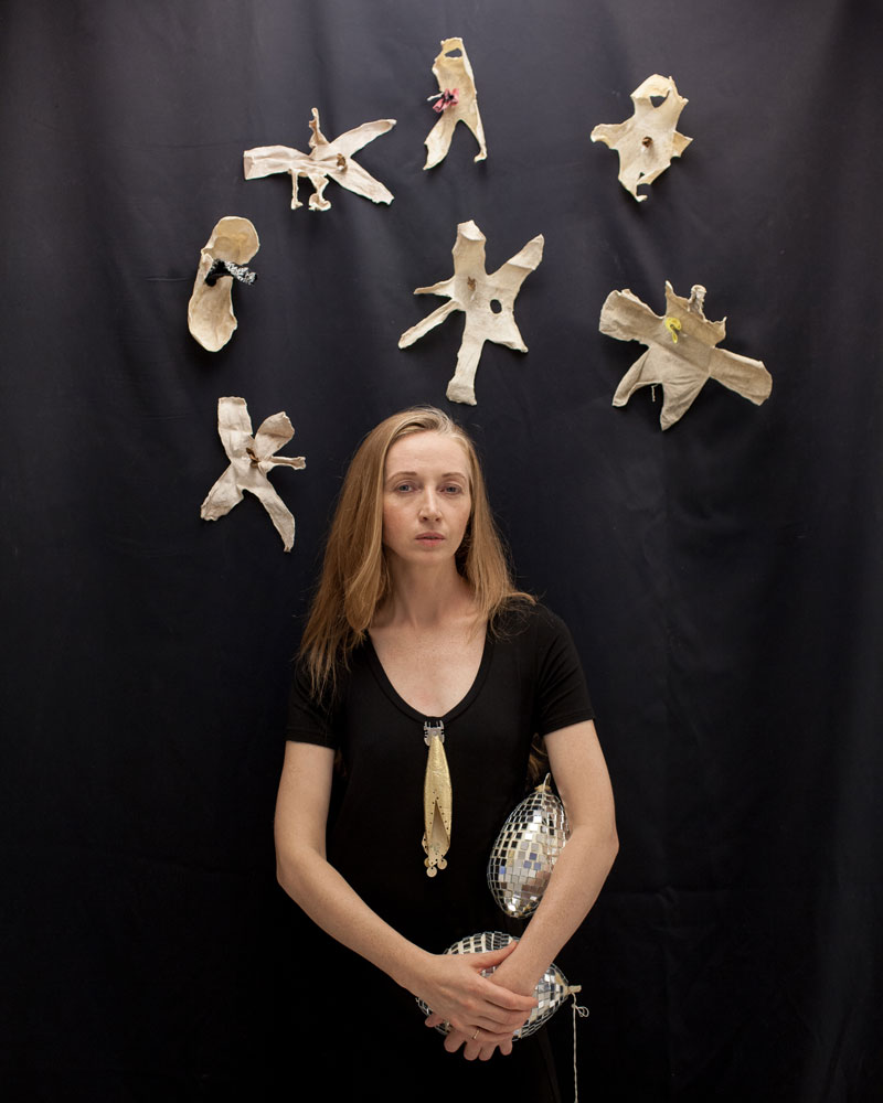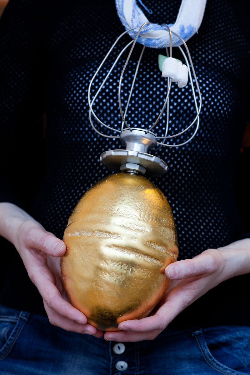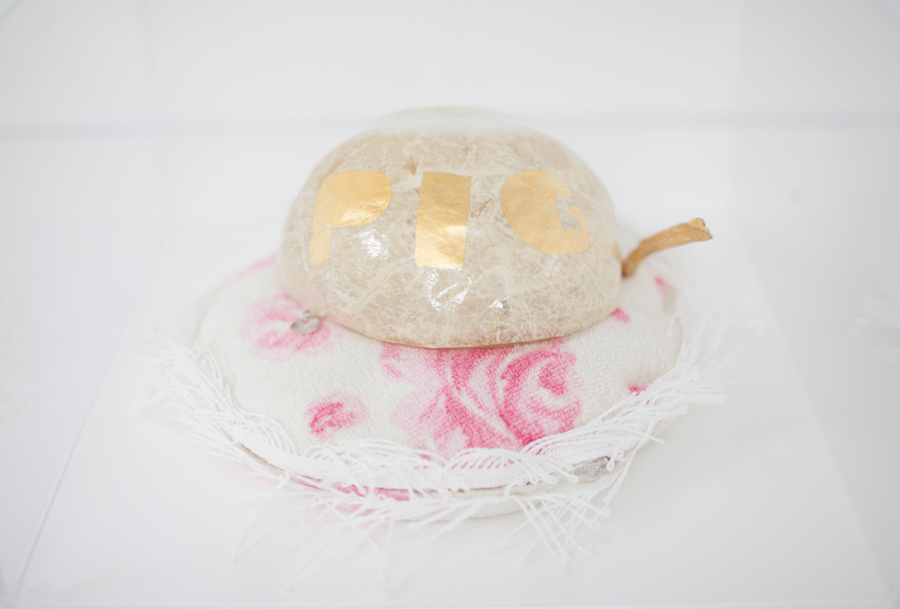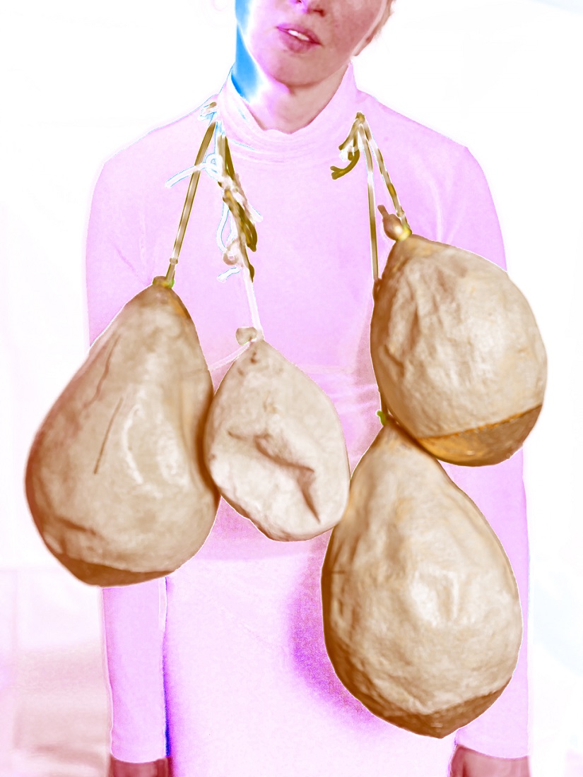 – Kiaulės pūslės tavo kūryboje naudojamos įvairiais pavidalais. Kartais jos būna kaip objektai, kaip dideli karoliai erdvėje, kartais tarnauja kaip žaliava kitiems objektams gaminti. Iš kiaulės pūslių kaip iš pergamento tu padarai knygos lapus, supjaustytos lakšteliais ir padengtos auksu pūslės tampa segėmis. Toks pakankamai neįprastas ir netikėtas objektas – kiaulės pūslė – tapo savotiška tavo vizitine kortele, medžiaga, iš kurios galima tave atpažinti. Kaip pirmą kartą sugalvojai jas panaudoti?