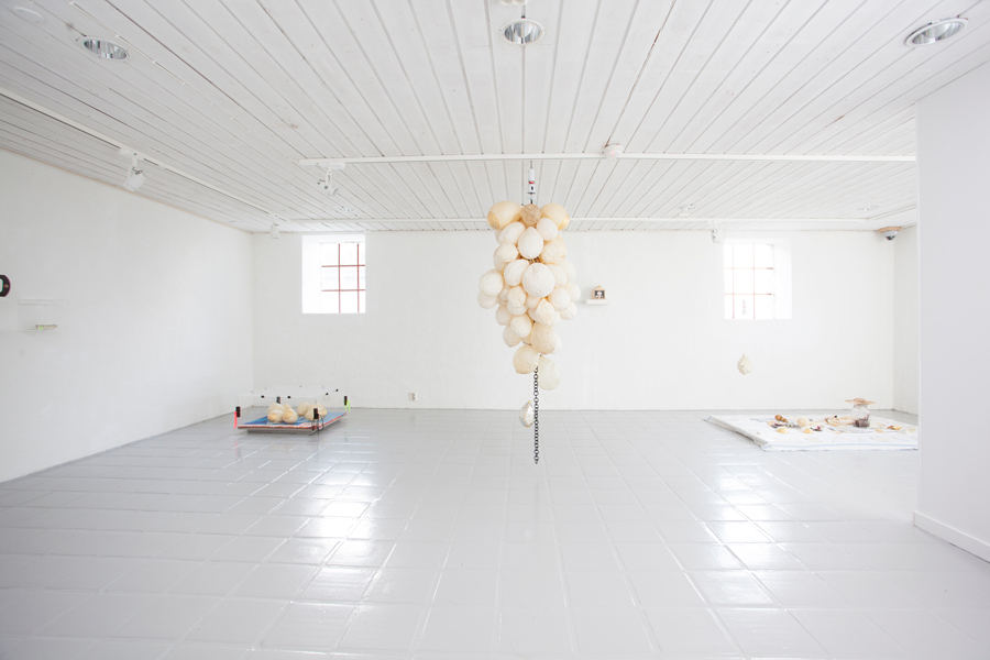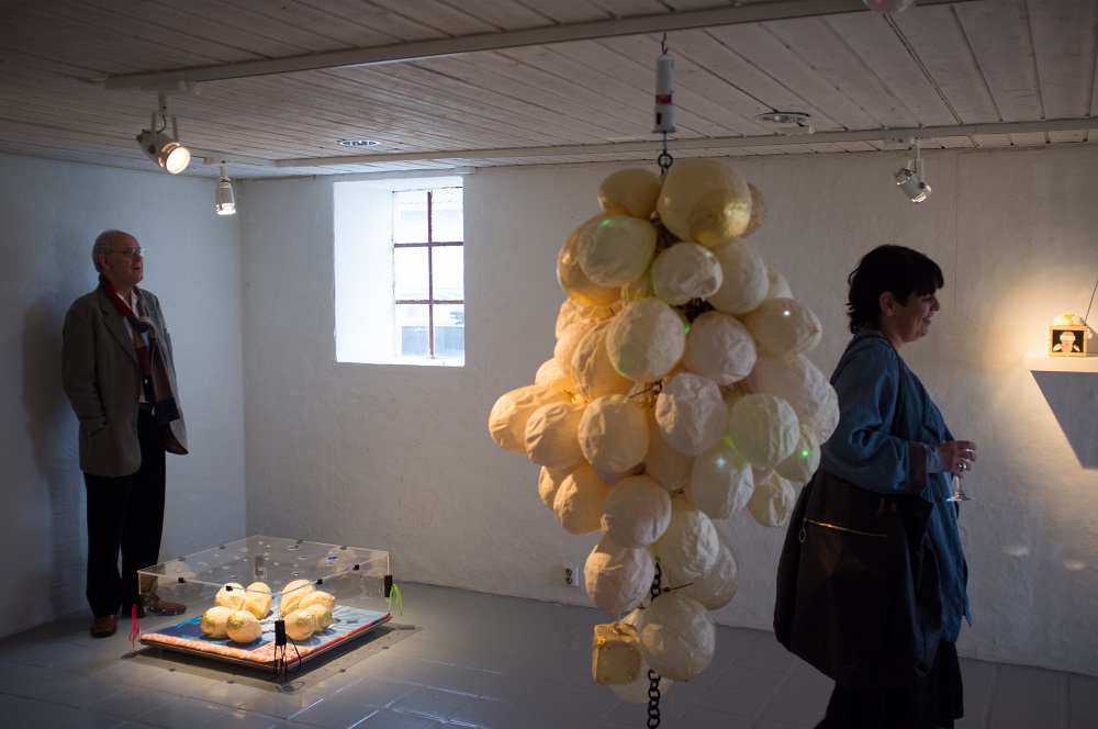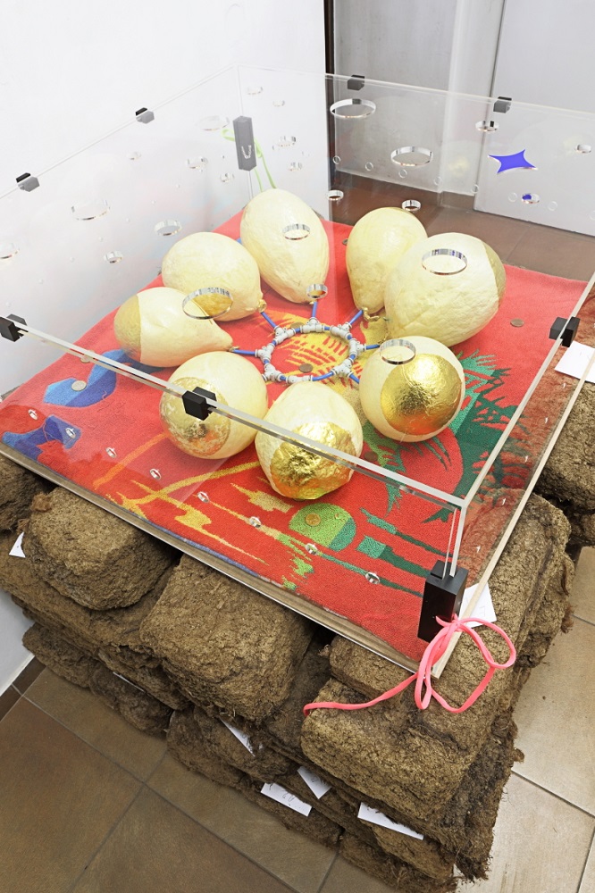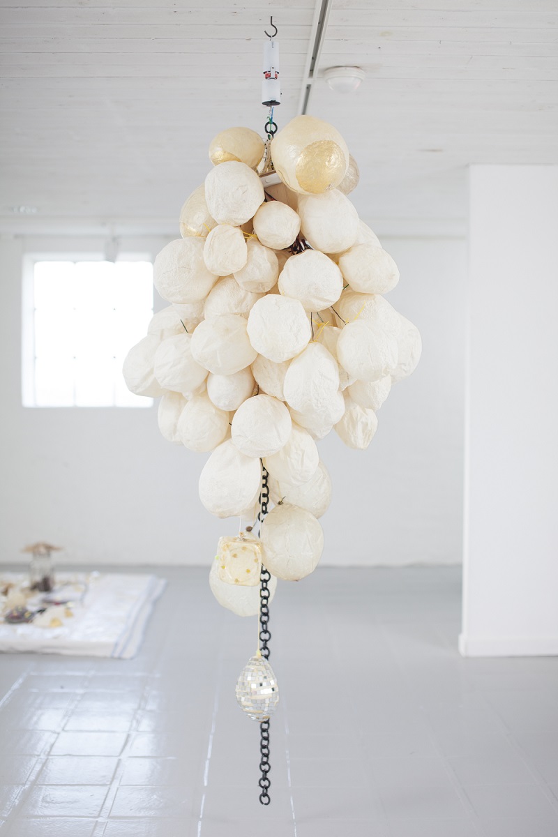 Pūslių instaliacija. Kiaulės pūslė, aukso lapeliai, siūlas, stiklas, žirniai, saulėgrąžos. | Eivind Egeland nuotr.