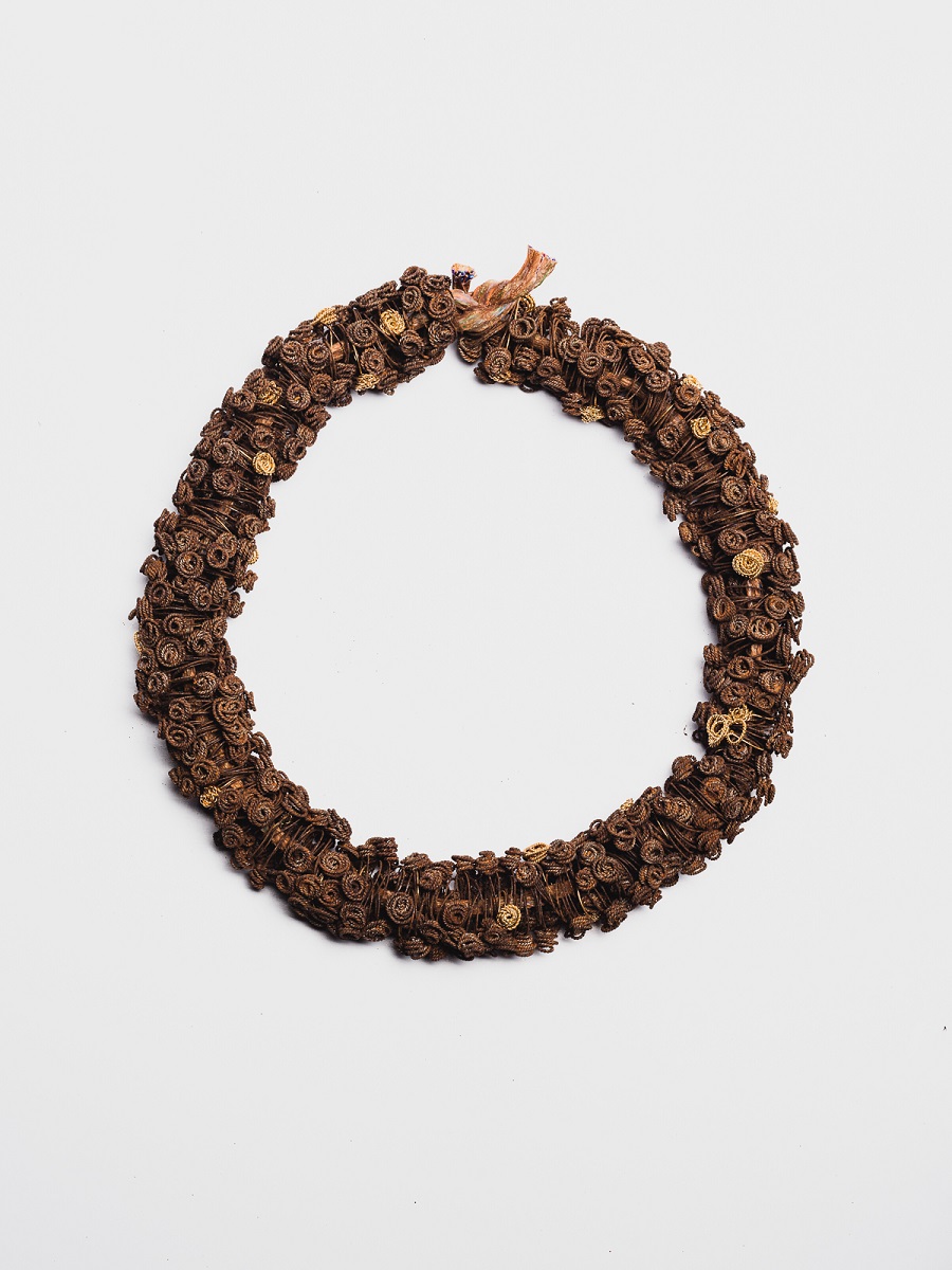 – Aš ilgai apie tai galvojau, skaičiau specialybines knygas, kad susivokčiau, ką darau. Gal galima būtų sakyti, kad tai – juvelyrikos objekto menas? Pavyzdžiui, kad ir mano kuriami kaklo papuošalai iš surūdijusių žiedų – jie nėra funkcionalūs, juos sunku nešioti, jie tam neskirti, jie nepatogūs. Jie daug labiau yra objektai, nei papuošalai. Jie turi funkciją, galima juos užsidėti, bet nėra patogumo, tai jokiu būdu ne juvelyrikos dizainas. Dizaine patogumas nepaprastai svarbus, viskas turi reikšmę – ir daikto svoris, ir funkcionalumas. Neseniai skaičiau Alba‘os Cappelieri knygą „Jewellery from Art Nouveau to 3D Printing“, kurioje kaip tik rašoma, kad juvelyrikos laukas dabar toks platus, kad jame telpa ir menininkai, kurie tą pritaikomumą išlaiko, bet yra ir svarbių autorių, kurie atsisako pritaikomumo ir pereina į juvelyriką kaip objektą. Manau, kad mano darbai kaip tik tokie ir yra.