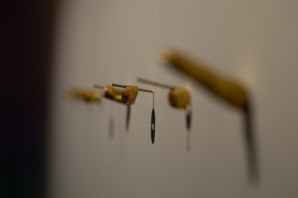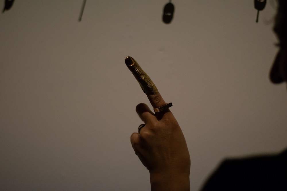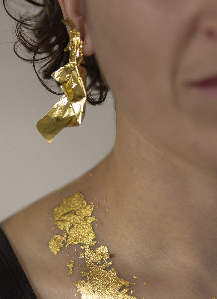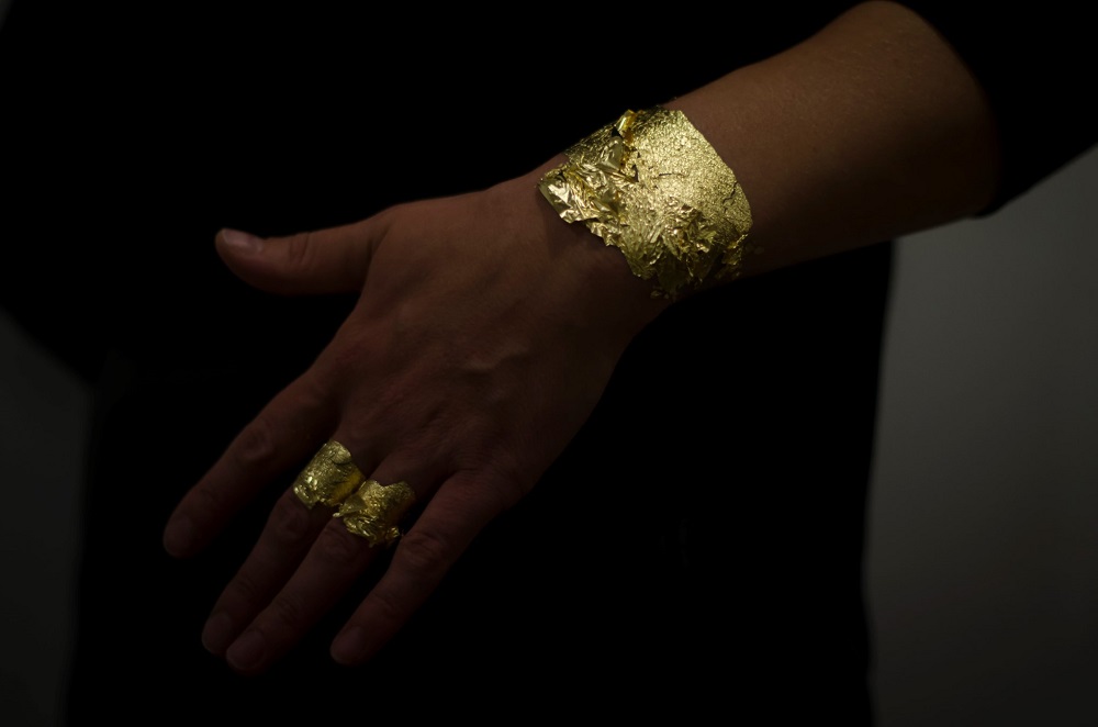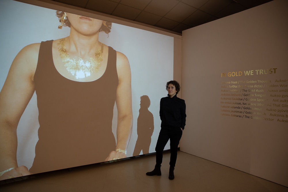 – Santykis su kūnu ir yra galbūt vienintelis dalykas, išduodantis, kad mano kūriniuose visgi galima aptikti juvelyriką. Pavyzdžiui, eksponuodama savo solo parodą Klaipėdos kultūrų komunikacijų centro parodų rūmuose 2019-aisiais vienoje iš instaliacijų (jos pavadinimas „In gold we trust“ buvo pasirinktas ir kaip visos parodos pavadinimas), video darbe ant savęs dėjau 24 karatų auksą. Kitos prasminės detalės, kaip aukso žodžiai, auksinės odos bateliai, aukso imitacijos, tekstilinė striukė, buvo tik elementai, pirštu bakstelėjantys į medžiagos fiktyvumą ir utopinį reikšmingumą. Įveiklindama savo kūną instaliacijoje demonstruoju savo asmeninę galią valdyti šią medžiagą ir elgtis, kaip tik noriu. Tačiau tą gali padaryti bet kuris iš jūsų! Todėl niekada nevengiu ir papildomų „žaidimo“ elementų, kurie parodytų, kad tas objektas iš tikrųjų tėra tik daiktas, kol su juo nepradedi žaisti. Tai reiškia, kad bet koks konceptualios juvelyrikos objektas gali ištransliuoti pagrindinę mintį tik drauge su kūnu. Bet net ir tuomet man įdomiau, kai tas objektas yra ne dekoratyvus, o labiau provokatyvus. Tarkim, auksiniai žiedai, toje pačioje instaliacijoje išeksponuoti ant į sieną sukaltų vinių, buvo atlieti nuimant atspaudus nuo mano rankų, pirštų odos. Pati mintis nėra nauja, tai šimtą kartų matytas dalykas, panašių galima rasti bet kokiame kataloge. Bet mano instaliacijoje tikslas buvo tiesmukai žiūrovui parodyti, jog jo paties kūnas irgi gali būti puošmena. Kad kūno nereikia kažkaip specialiai performuoti, išblizginti ir nupoliruoti, kad tiktų menui, bet kad pats žiūrovo kūnas ir jo oda gali būti turinys. Provokavau paimti ir matuotis.