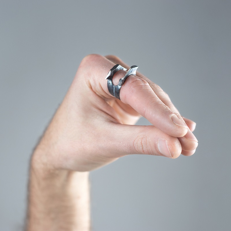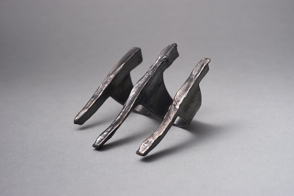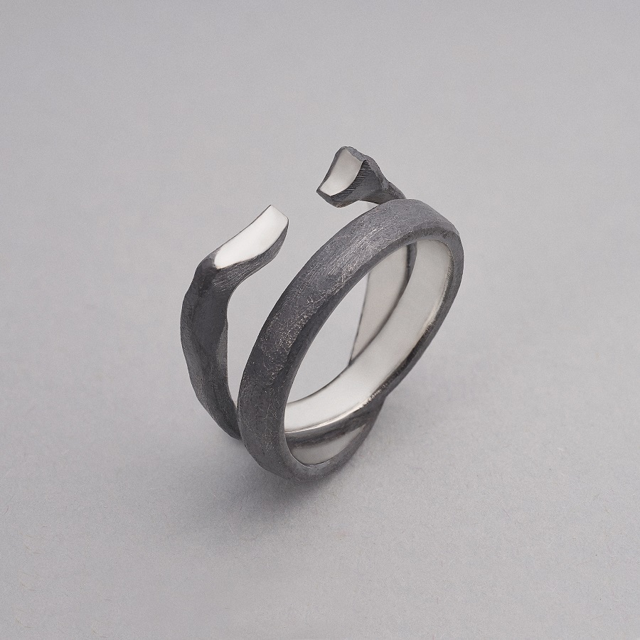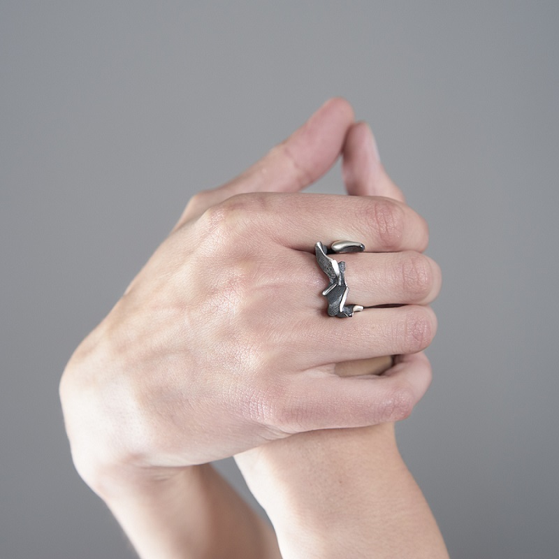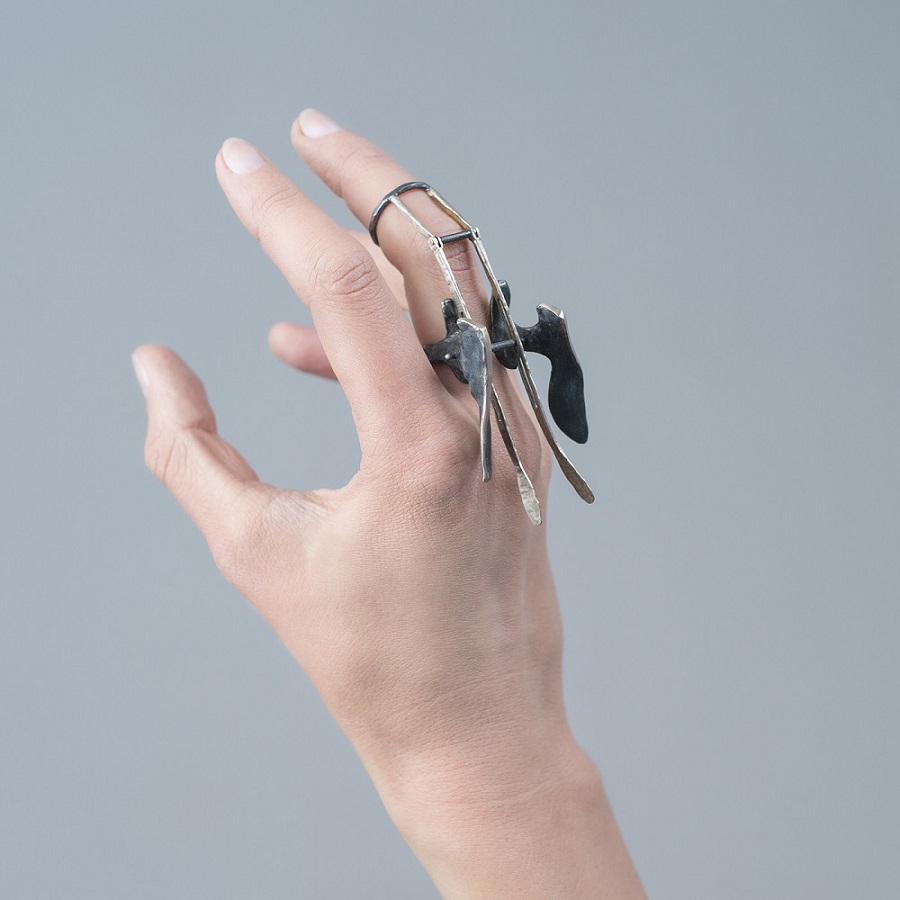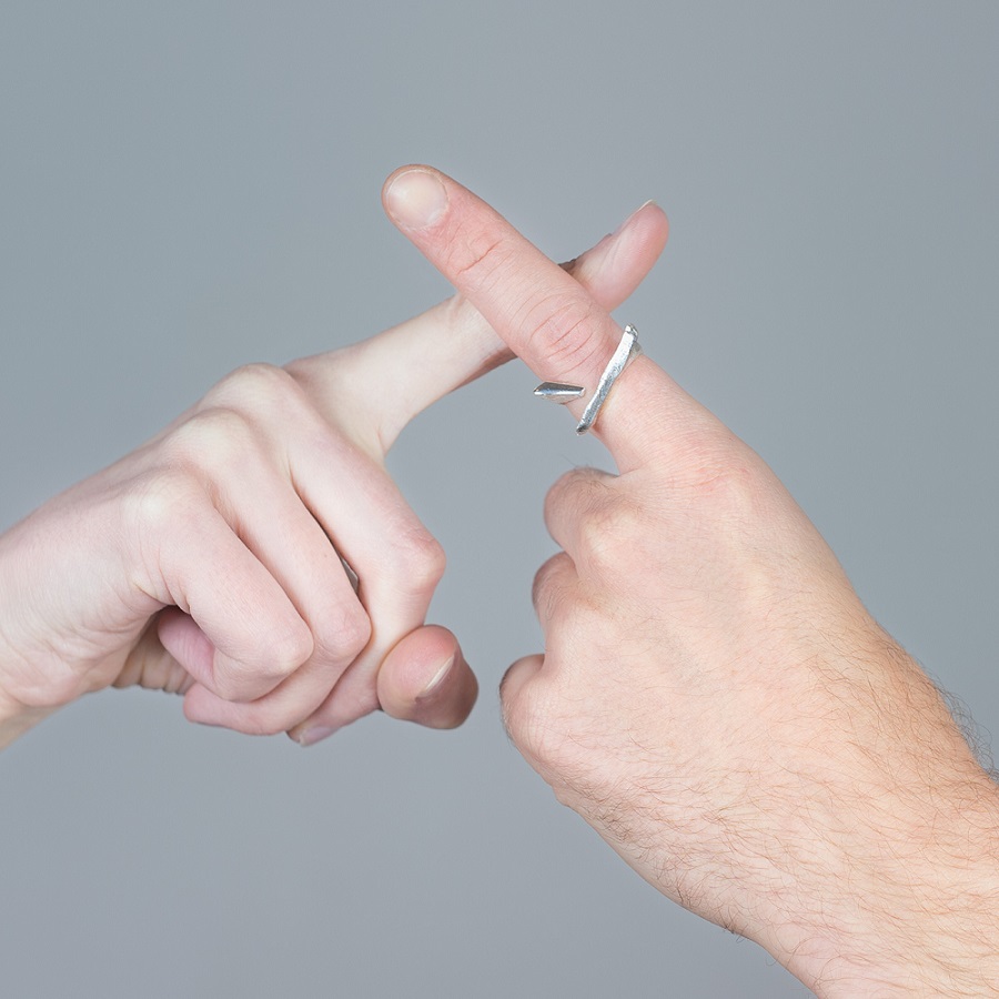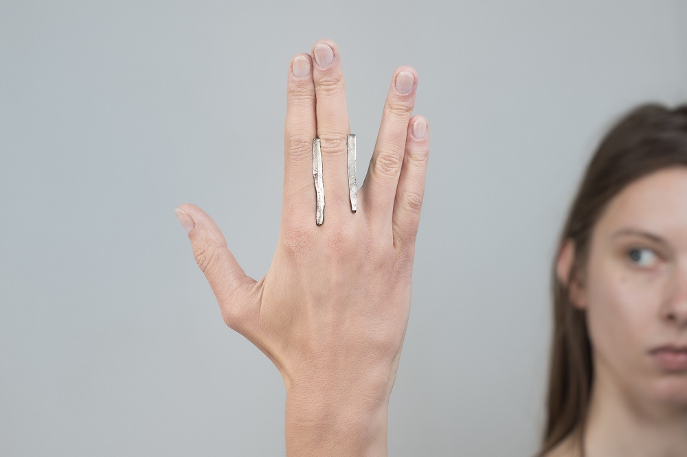 – Dabar klausantis pagalvojau, kad kalbame apie jūsų darbus, tarsi jie būtų ne papuošalai, o kūno tęsiniai transhumanistine prasme. Nežinant kaip jie atrodo, būtų galima pagalvoti, kad tai – kokie nors sensoriai, kas nors, kas susijęs su aukštosiomis technologijomis. O iš tiesų formos požiūriu jie labai santūrūs, labai rūstūs. Išties man jie irgi kėlė nepatogumo, nekomfortiškumo įspūdį, kol pirmą kartą, kuruodama parodą „METALOfonas: PARAŠAS“ nepasidaviau pagundai pasimatuoti kaip tik tą žiedą, užpildantį tarpus tarp pirštų. Buvau nustebusi, koks apgaulingas tas nepatogumo įspūdis. Tie žiedai nepaprastai patogūs. Ir po to, kai prisitaikai, į juos imi visiškai kitaip žiūrėti – būtent kaip į savo kūno dalį. Tuo tarpu gulėdami jie atrodo labiau kaip mažoji plastika. Savo stilistika jūsų kūriniai labai skulptūriški. Kita vertus, jeigu kalbėtume nebe apie formą, o apie turinį – jūsų kūryba labai antropocentriška. Darbai yra skirti žmogui, ir jūsų inspiracijos šaltinis yra žmogus.