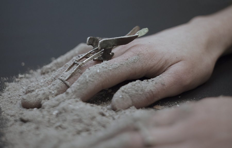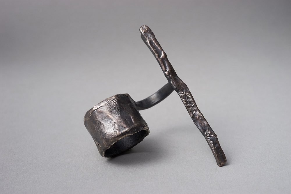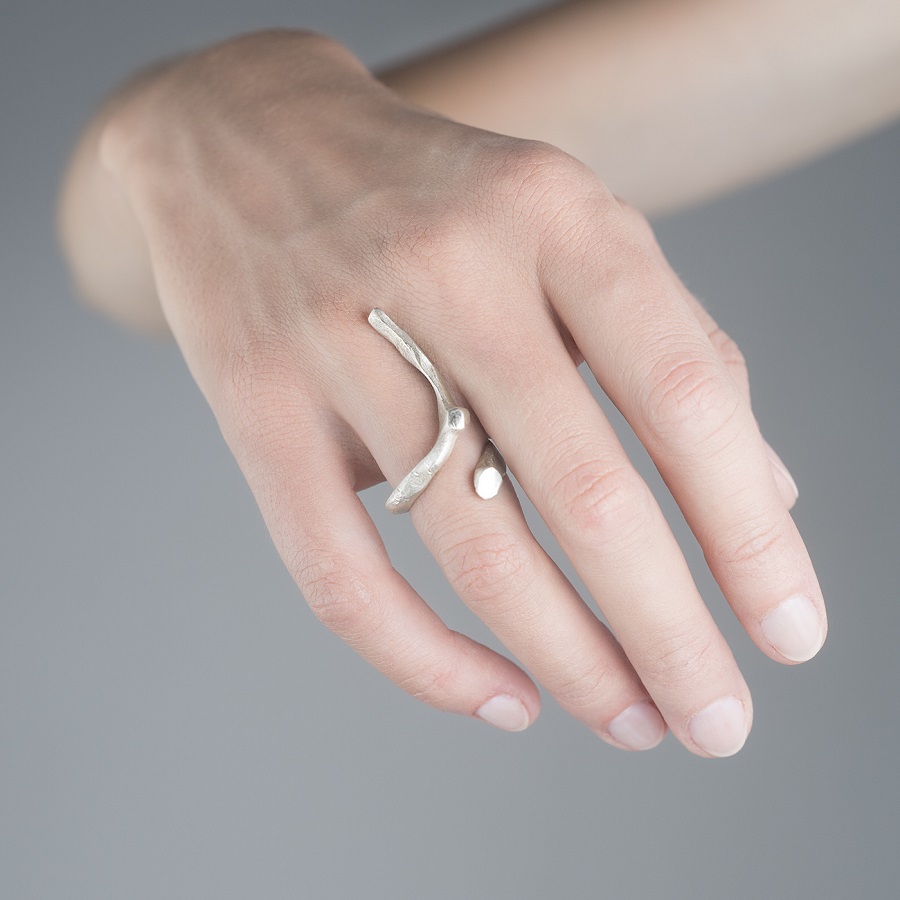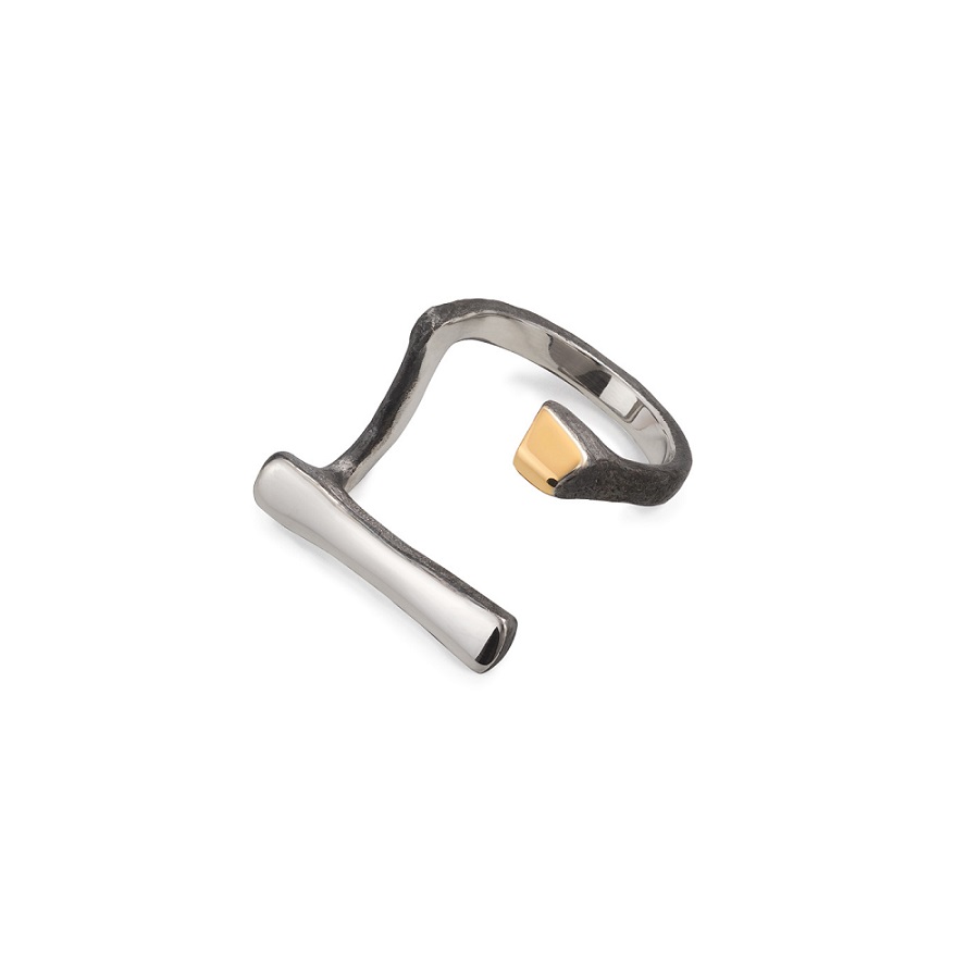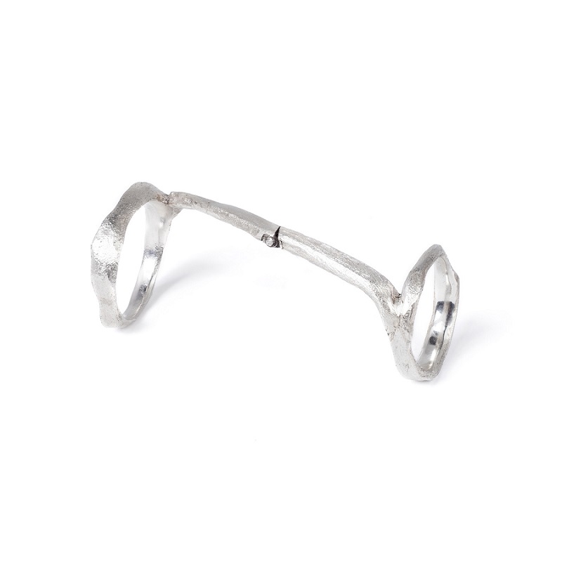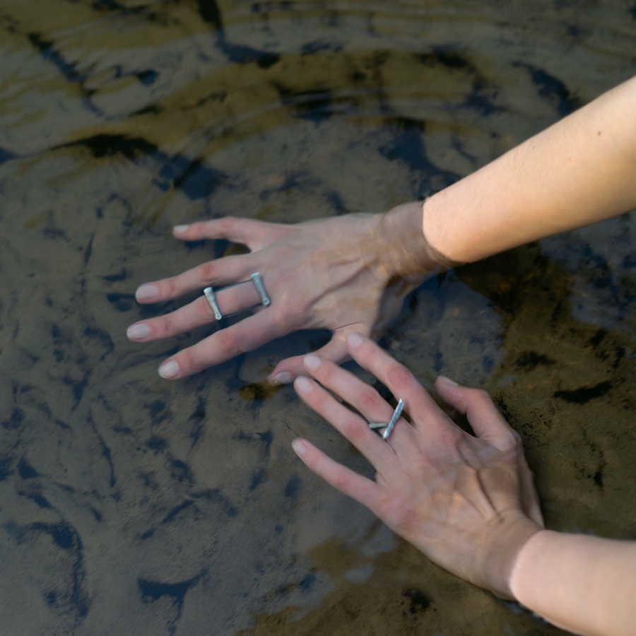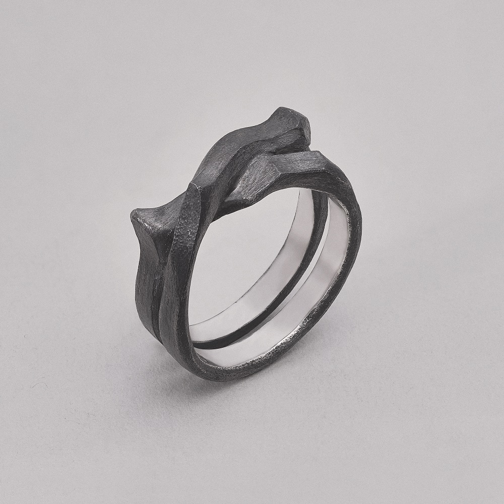 – Dabar klausantis pagalvojau, kad kalbame apie jūsų darbus, tarsi jie būtų ne papuošalai, o kūno tęsiniai transhumanistine prasme. Nežinant kaip jie atrodo, būtų galima pagalvoti, kad tai – kokie nors sensoriai, kas nors, kas susijęs su aukštosiomis technologijomis. O iš tiesų formos požiūriu jie labai santūrūs, labai rūstūs. Išties man jie irgi kėlė nepatogumo, nekomfortiškumo įspūdį, kol pirmą kartą, kuruodama parodą „METALOfonas: PARAŠAS“ nepasidaviau pagundai pasimatuoti kaip tik tą žiedą, užpildantį tarpus tarp pirštų. Buvau nustebusi, koks apgaulingas tas nepatogumo įspūdis. Tie žiedai nepaprastai patogūs. Ir po to, kai prisitaikai, į juos imi visiškai kitaip žiūrėti – būtent kaip į savo kūno dalį. Tuo tarpu gulėdami jie atrodo labiau kaip mažoji plastika. Savo stilistika jūsų kūriniai labai skulptūriški. Kita vertus, jeigu kalbėtume nebe apie formą, o apie turinį – jūsų kūryba labai antropocentriška. Darbai yra skirti žmogui, ir jūsų inspiracijos šaltinis yra žmogus.
