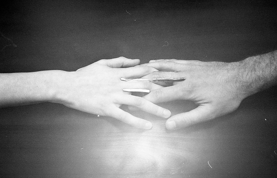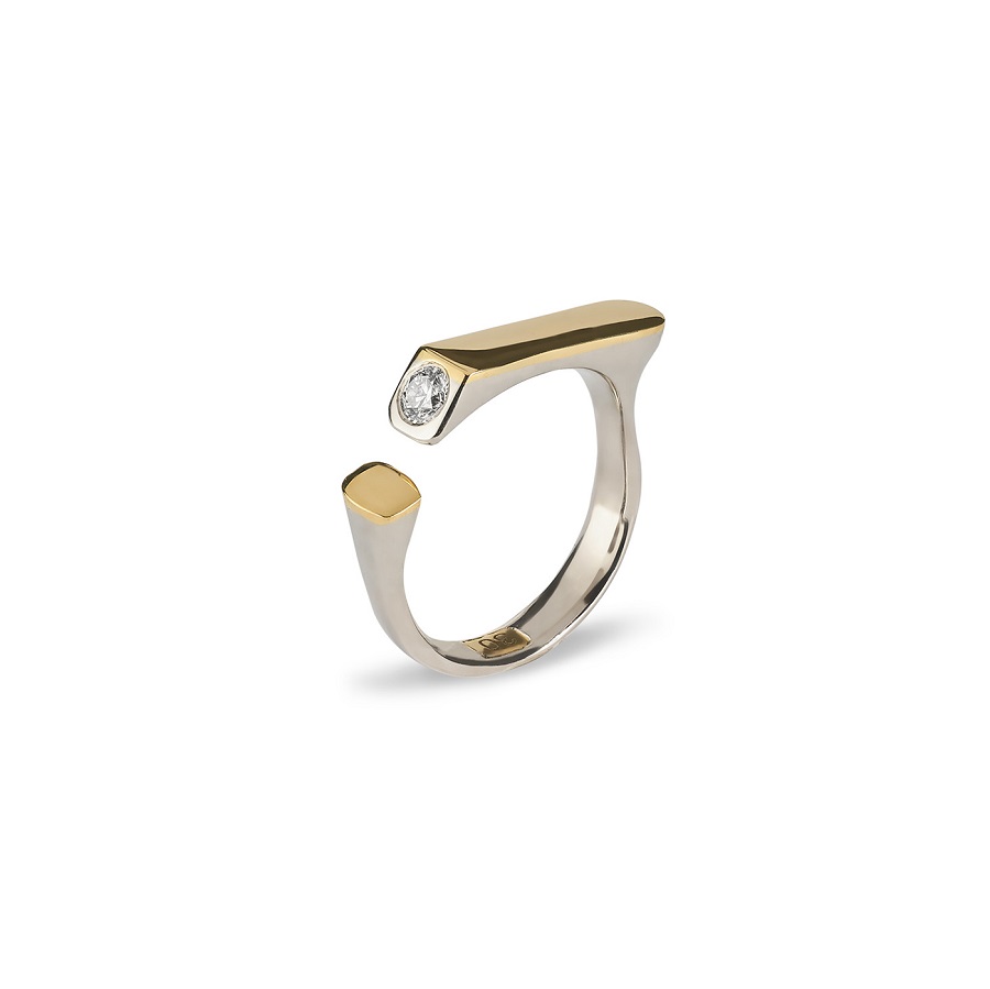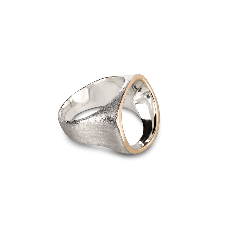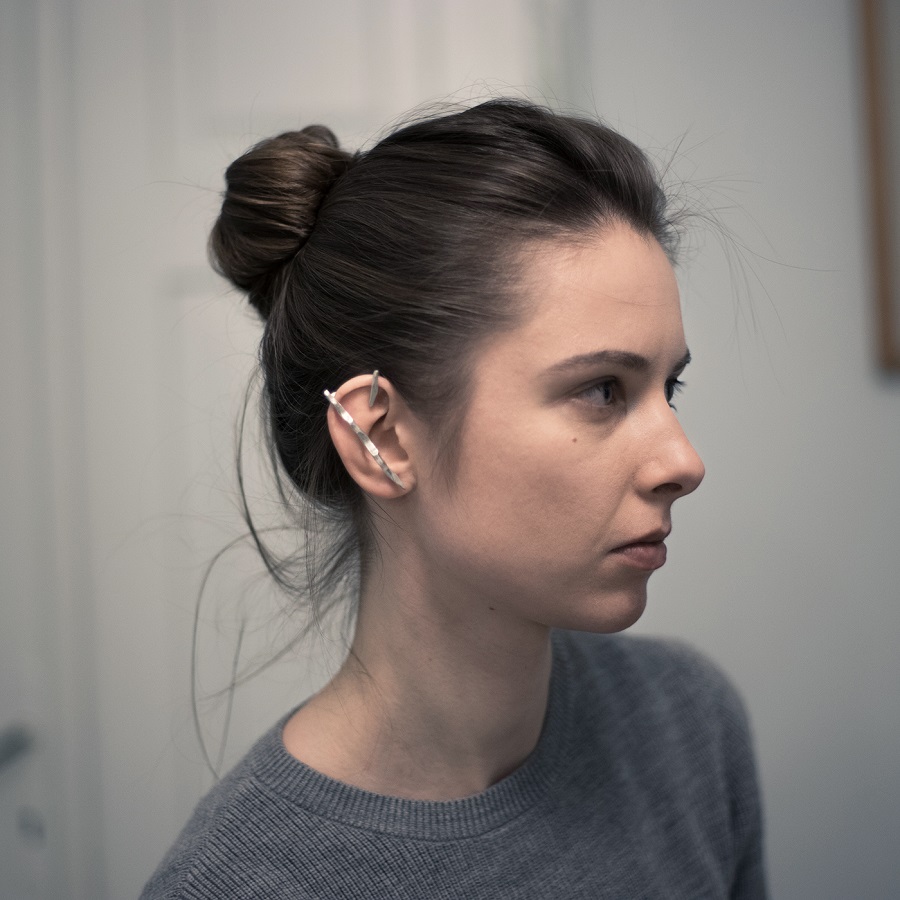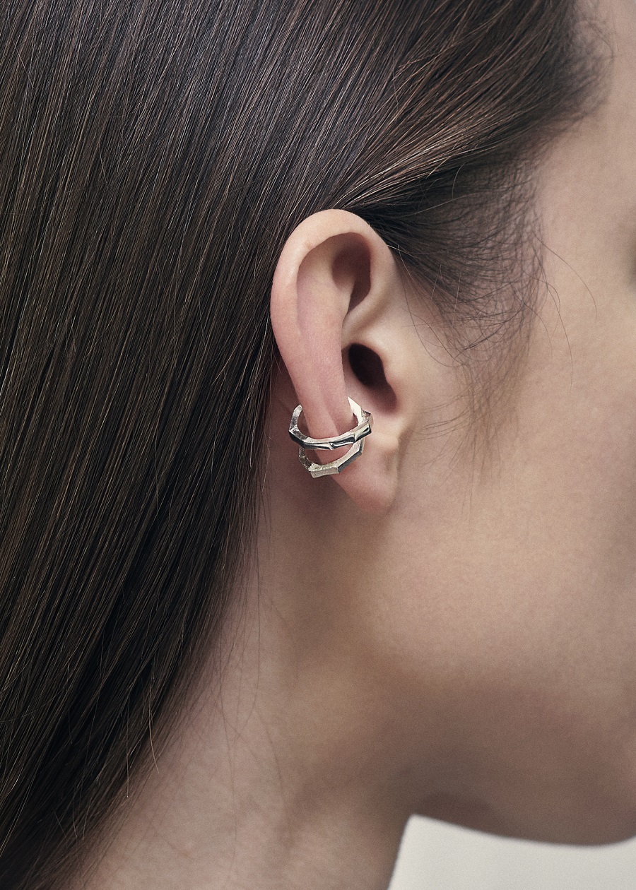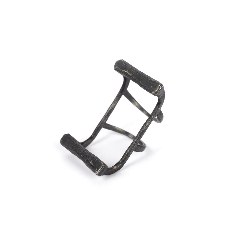 – Dabar klausantis pagalvojau, kad kalbame apie jūsų darbus, tarsi jie būtų ne papuošalai, o kūno tęsiniai transhumanistine prasme. Nežinant kaip jie atrodo, būtų galima pagalvoti, kad tai – kokie nors sensoriai, kas nors, kas susijęs su aukštosiomis technologijomis. O iš tiesų formos požiūriu jie labai santūrūs, labai rūstūs. Išties man jie irgi kėlė nepatogumo, nekomfortiškumo įspūdį, kol pirmą kartą, kuruodama parodą „METALOfonas: PARAŠAS“ nepasidaviau pagundai pasimatuoti kaip tik tą žiedą, užpildantį tarpus tarp pirštų. Buvau nustebusi, koks apgaulingas tas nepatogumo įspūdis. Tie žiedai nepaprastai patogūs. Ir po to, kai prisitaikai, į juos imi visiškai kitaip žiūrėti – būtent kaip į savo kūno dalį. Tuo tarpu gulėdami jie atrodo labiau kaip mažoji plastika. Savo stilistika jūsų kūriniai labai skulptūriški. Kita vertus, jeigu kalbėtume nebe apie formą, o apie turinį – jūsų kūryba labai antropocentriška. Darbai yra skirti žmogui, ir jūsų inspiracijos šaltinis yra žmogus.