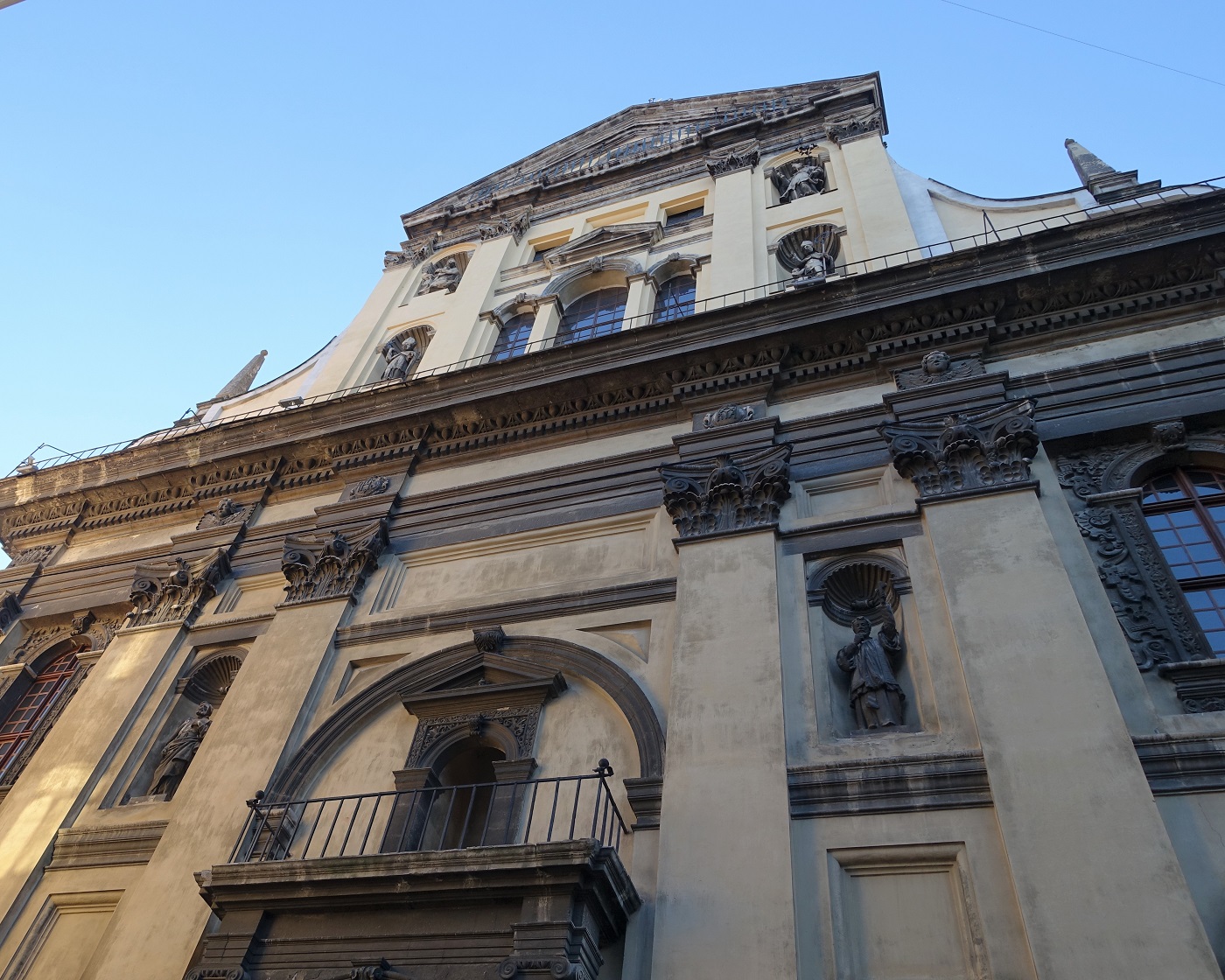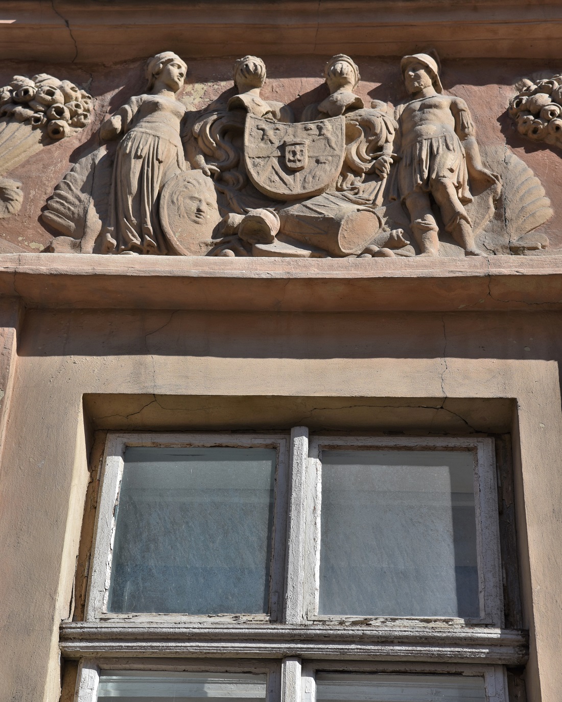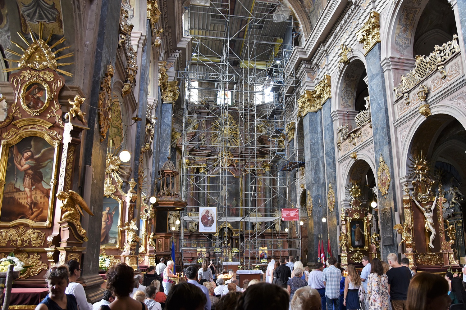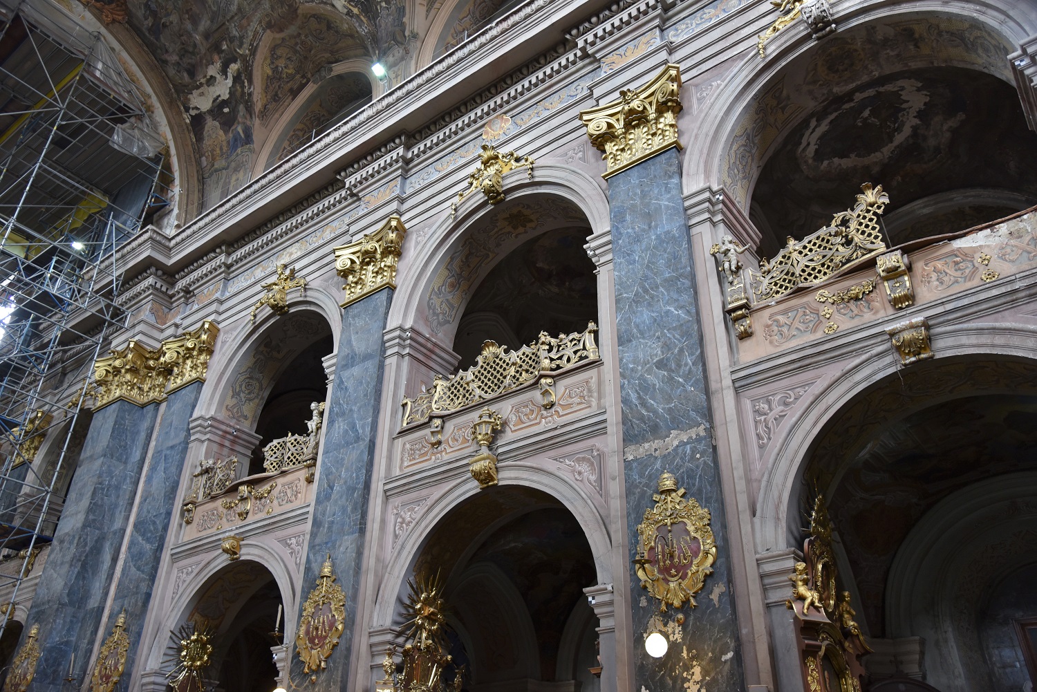 Bernardinų bažnyčios frontono kairėje pusėje – Lenkijos, dešinėje pusėje – Lietuvos heraldiniai ženklai, 2016 m. | Foto: © „Vilniaus galerija“ / Audrius Klimas