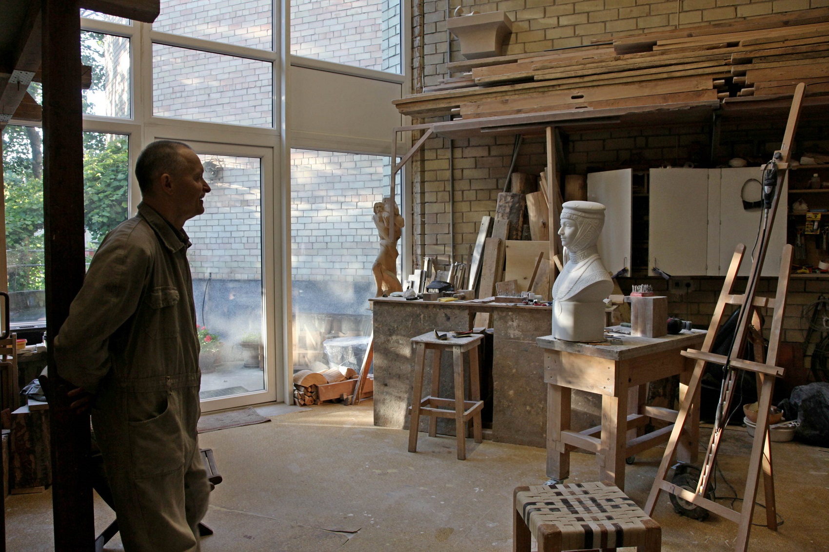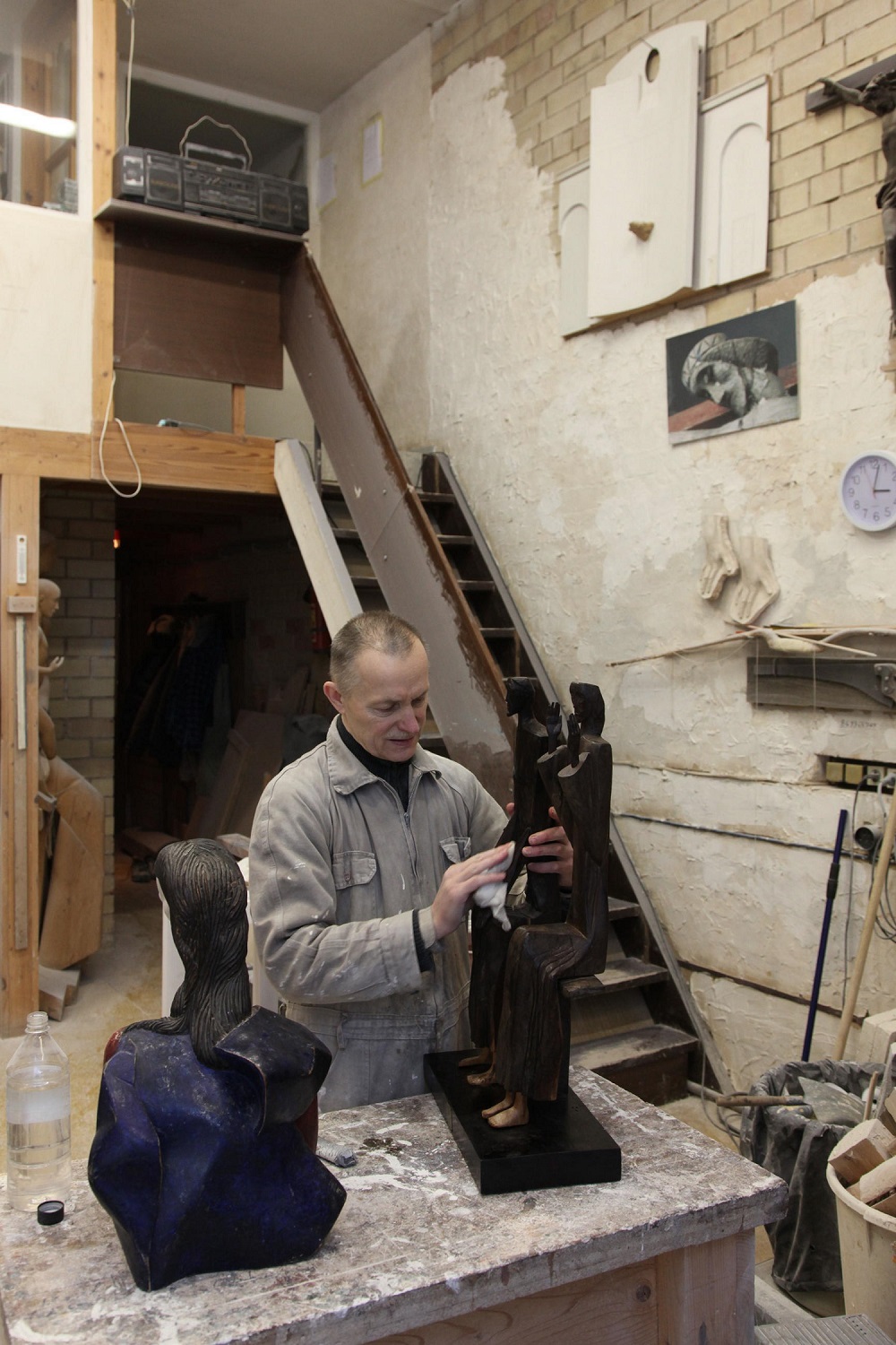 Jis labai gerai išnaudodavo laiką: jei ilsisi, tai ilsisi, o kai dirba, tai dirba. Dirbtuvės neturėjome, tai toj pačioj patalpoj Jeruzalėje ir drožė. Sūnus gimė, tai ugnelę kūrenam, ir vystiklai, pamazgų ir švaraus vandens kibiras, – viskas vienoj patalpoj. Ir lovytė, ir darbo stalas… Tarp drožlių visą laiką ir gyvenome. Paskui gavome butą, persikėlėme į Krivių gatvę. Viename kambaryje visi miegojome, o kitame jis pradėjo dirbti. Kirvis, kaladės, tik pasidėdavo porą vatinių čiužinių, nes porąkart sulenki jie sugeria garsą. Jei reikdavo, kartais ir vėlai, jau grįžęs iš darbo Dailės institute, dudendavo. Bet kaimynai buvo pakantūs.