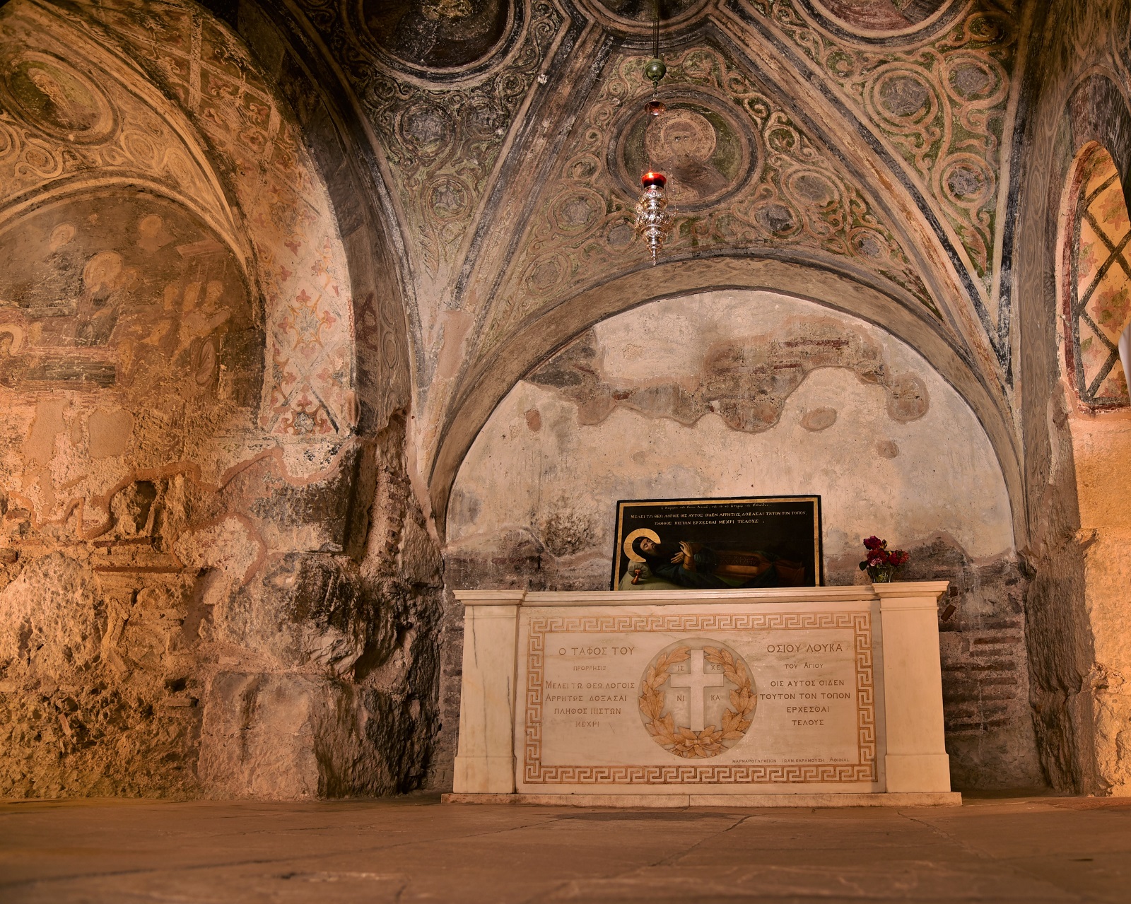 Kalbant apie vienuolyno įkūrimą, būtina pradėti nuo graikų vienuolio ir šventojo Luko kuris, kaip pasakojama, turėjo gydymo dovaną ir gebėjo pasveikdinti net sunkiausius ligonius. Būtent šv. Lukas X amžiuje inicijavo bažnyčios statybas, čia jis ir palaidotas. Pasakojama, kad po šventojo mirties žmonės vis dar atvykdavę aplankyti relikvijų ir nakvodavę ne tik bažnyčioje ar vienuolyne, bet ir pačioje kriptoje. Teigiama, kad daugelis jų patirdavo įvairiausių stebuklų, dažniausiai susijusių su išgijimu. Be viso to, šv. Lukas dar galėjo nuspėti ateitį. Jam pavyko nustatyti Kretos išvadavimo datą, bulgarų invaziją ir net savo paties mirties dieną.